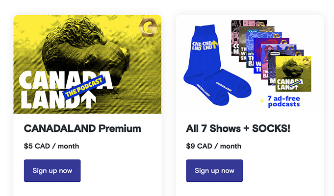 For example, let’s say you have a main show and multiple spin-offs. With Supercast, you could set up different subscription bundles, where each bundle contains the main show and one spin-off. Or you can create upsell paths, like Canadaland does. Subscribers can choose to buy the main show on its own, or get the main show plus six other shows in a bundle for a slightly higher price.